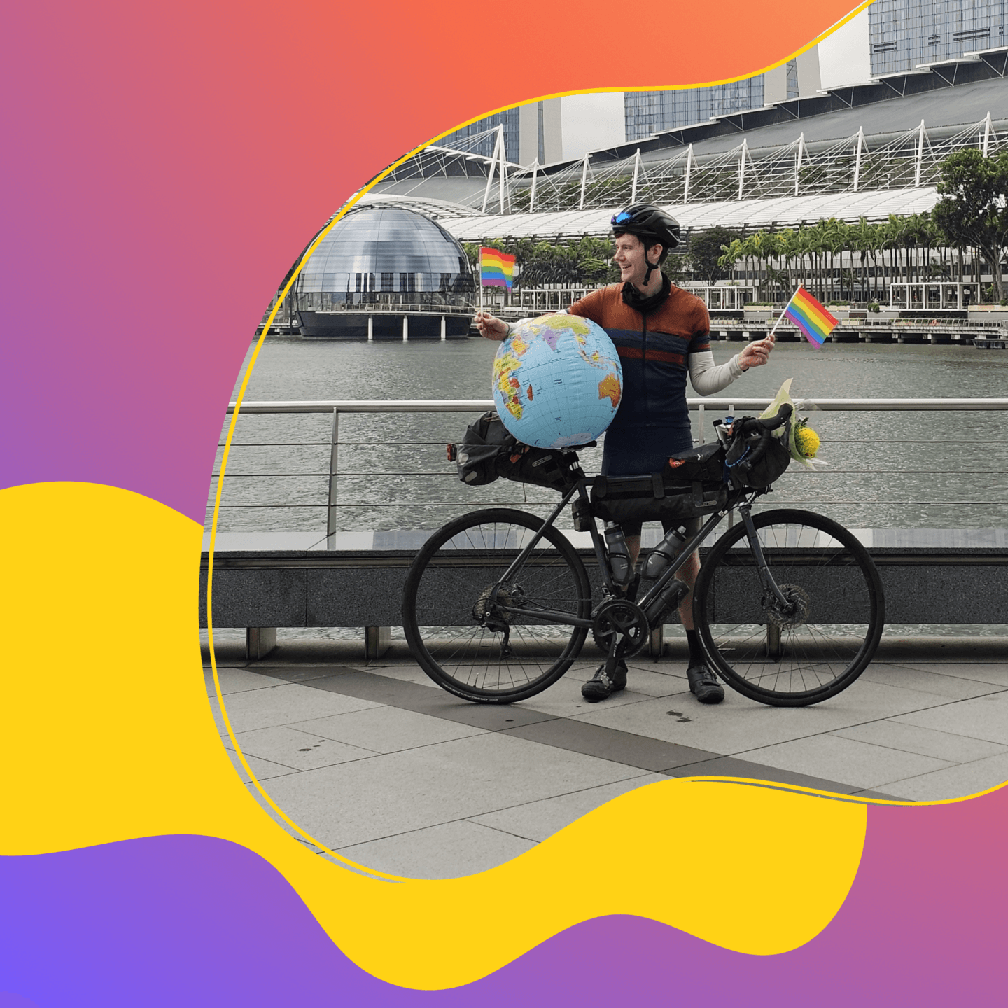 I had lost two friends who died by suicide. And that was in the year and a half before COVID started. And that was actually when I started volunteering for the Trevor Project as a crisis counselor. And so when I was about halfway through the U.S. that I would dedicate my ride for The Trevor Project and ride for my friends and for so many others who are in need of some support. So I finished the ride across the country and things were going great. Fundraising was going well. I loved the experience of being outdoors. I met so many incredible, affirming people and I decided, Forrest Gump-style, I would just keep going. I went into Mexico and all the way down to South America. That was eight months, 17,000 miles. And then I came back for grad school at the University of Texas and had some time. I thought, “why not finish the job, go around the world?” So I decided to ride from Spain to Singapore.